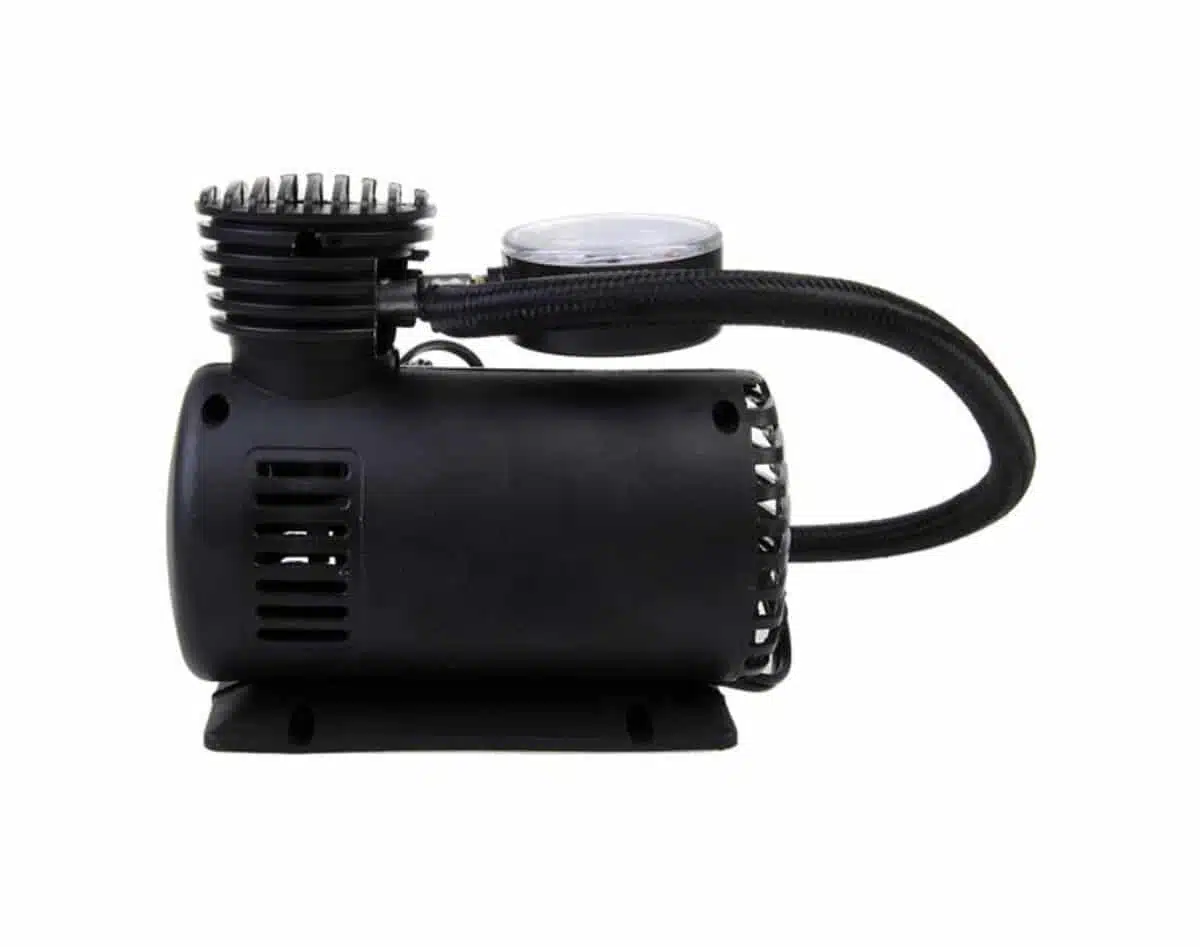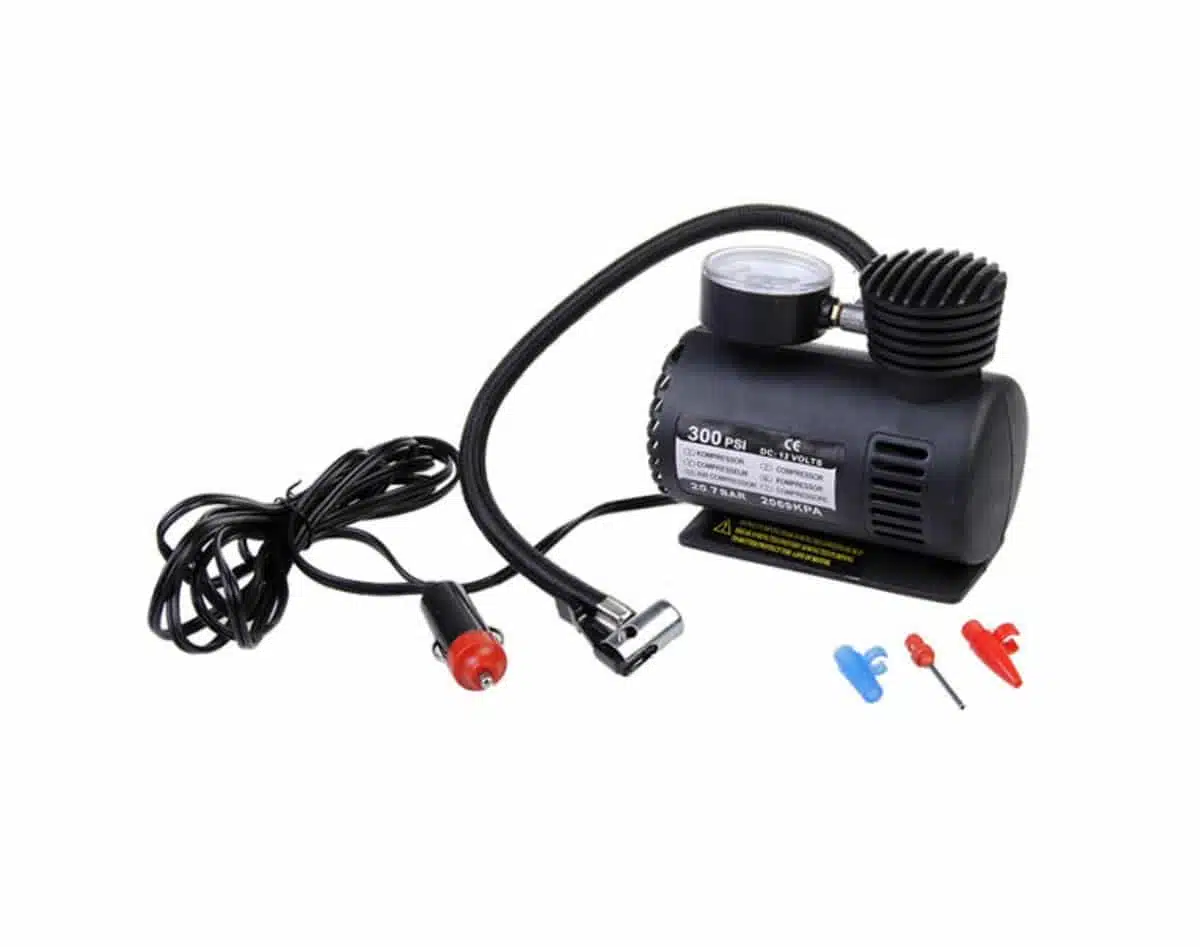 Luftkompressor 12V med manometer, 300 PSI. Leveres med diverse adapter slik at den i tillegg til bil også kan brukes til sykler, baller, gummibåter og luftmadrasser etc.