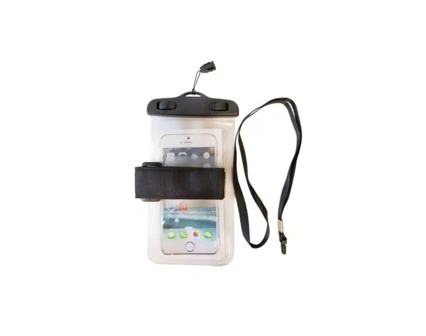 Vanntett lomme for mobiltelefon er laget i solid PVC og beskytter mobiltelefonen og andre verdifulle artikler mot støv og fuktighet. Posen leveres med håndledd- og skulderrem.