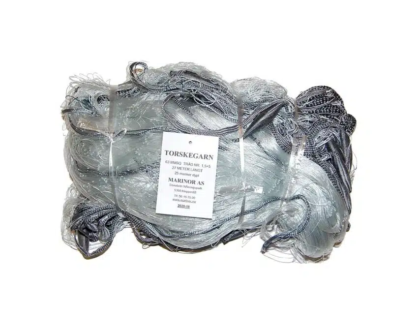 Torskegarn 1,5×5 – 63mm er ferdig montert multimono m/korkline 4/13 – blyline nr. 3 – 27 m langt – tråd nr. 1 1/2 x 5 – 28/40. Maskestørrelse er det samme som stolpelengden 63mm x 2 => 126mm.