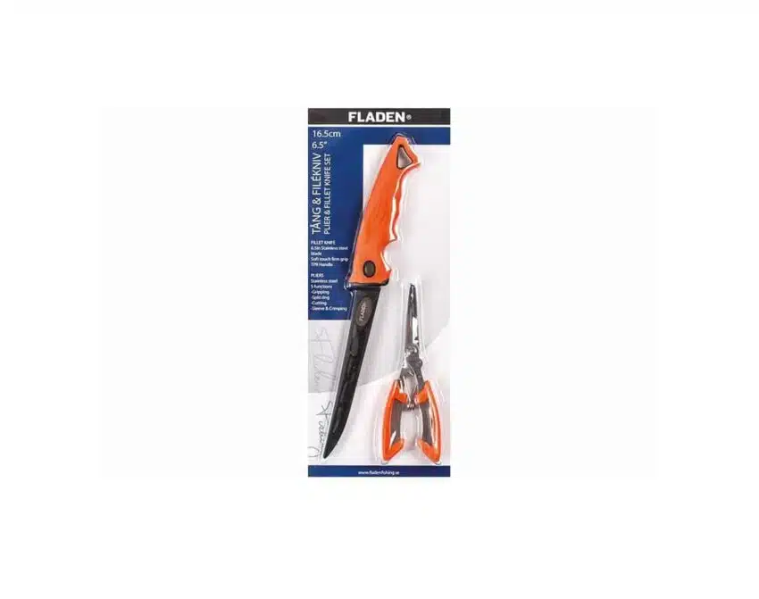 Fladen Filetkniv og Fisketang (splitring pliers) kommer med filetkniv med et 16cm tynt og rustfritt blad som holder seg skarpt lenge. Kniven har skaft i TPR som gir deg et sikkert og behagelig fingergrep. Tangen har tupp for å åpne splittringer, praktisk wire-kutter, og krympeåpning for hylser eller splitshot-søkker.
