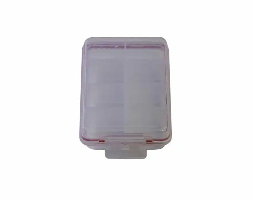 Vanntett Utstyrsboks 9x6x3cm fra Wiggler er en solid 8-roms oppbevaringsboks for tørr oppbevaring av småtterier som tørrfluer, splitthagl, svivler og crosslock etc.