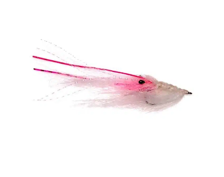 Pattegrisen Hvit er en effektiv rekeimitasjon til kystens laks og sjøørret. Fluen er bundet på enkelkrok i #6.
