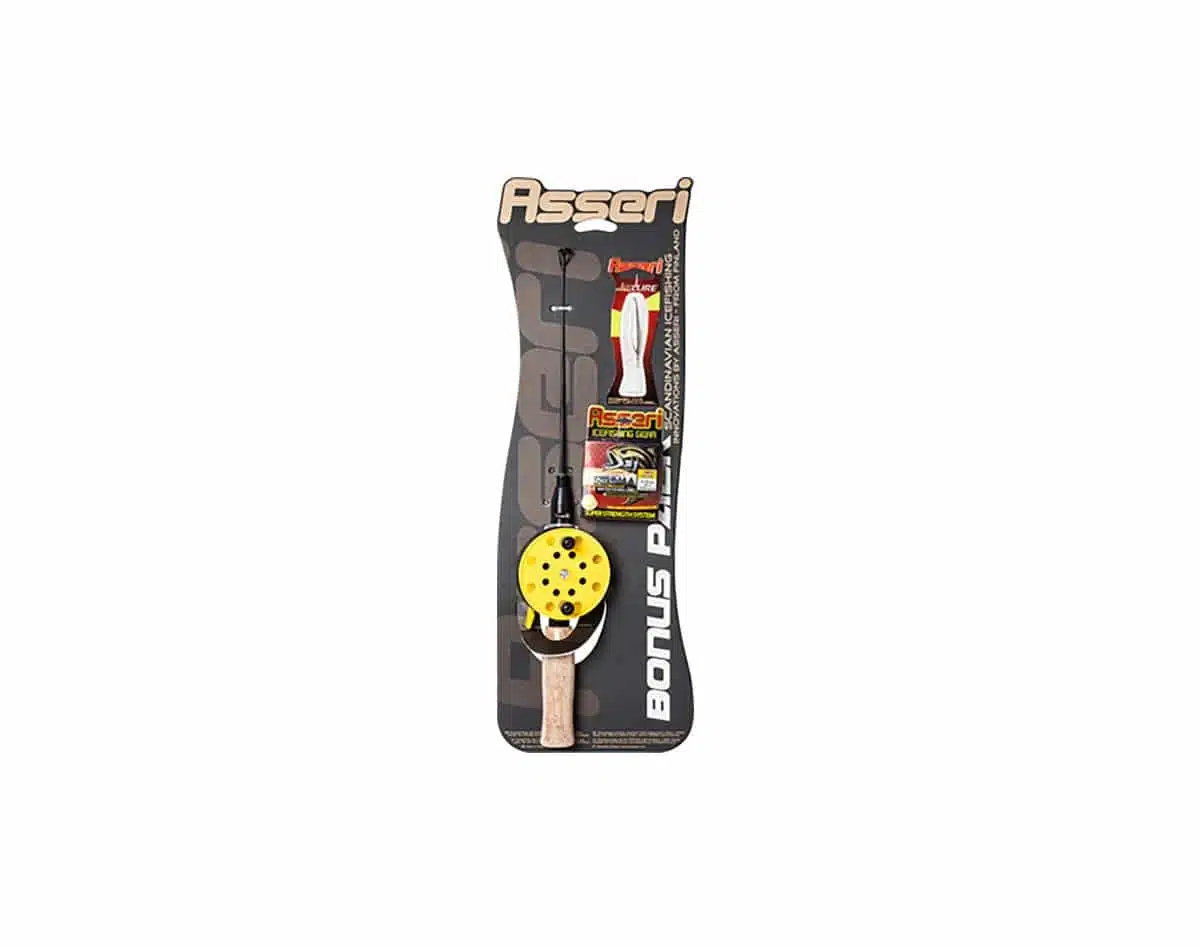 Asseri Pilkesett m/Balansepilk og Sene passer aller best til fiske etter ørret og røye, men fanger også arter som abbor og sik. Settet leveres med pilkestikke med dobbelsveiv, en spole med 25 meter tilpasset sene og en pimpel med krok.