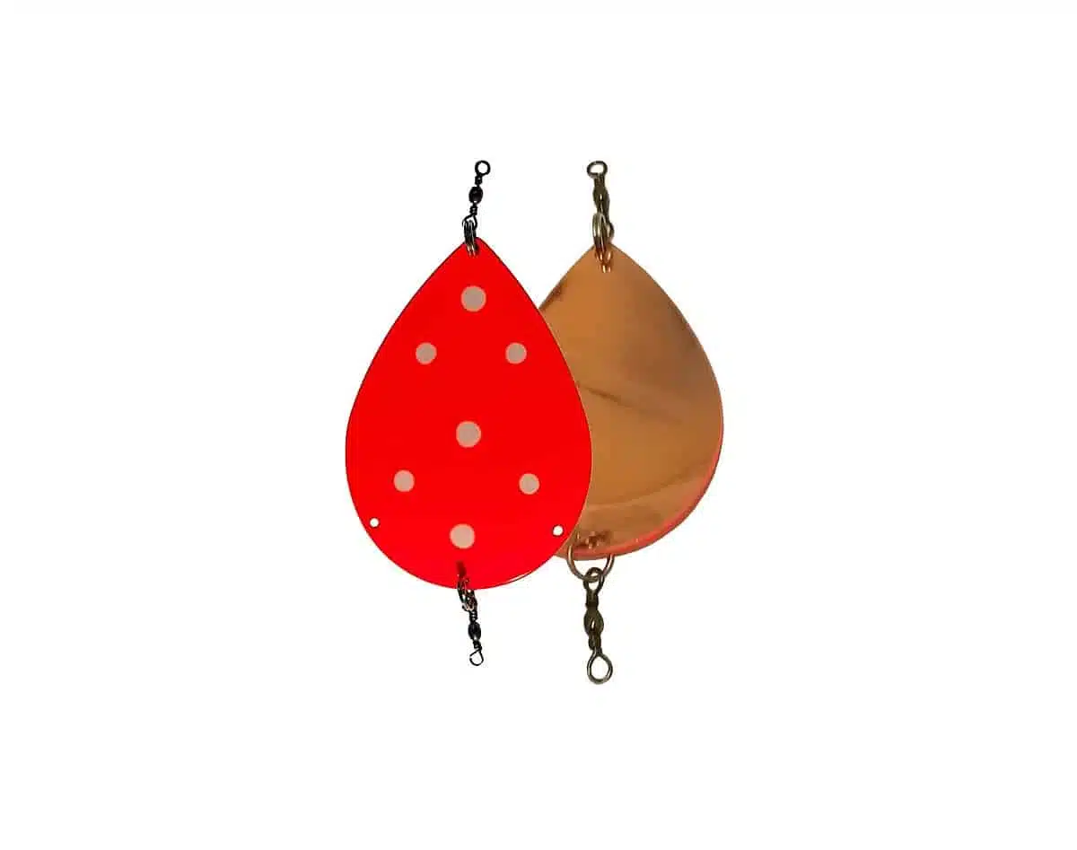 Dividalsblinken UV – Fluo Orange/Perlemor er en røyeblink alle isfiskere som er ute etter røye burde ha med seg. Den har en klassisk form og på baksiden er den i kobber.