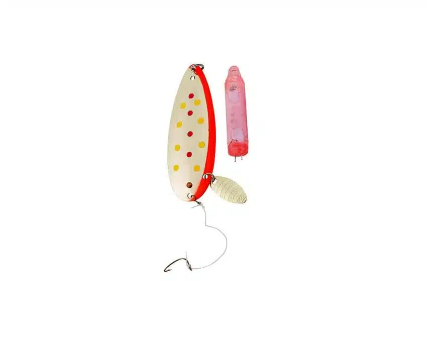 Trønderblink 85mm Gull prikk er en klassisk røyeblink med effektive innslag av kontrastfarger. I tillegg følger det med LED-blink, en ekstra liten lokkeskje og ferdig montert maggotkrok.