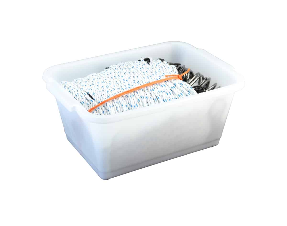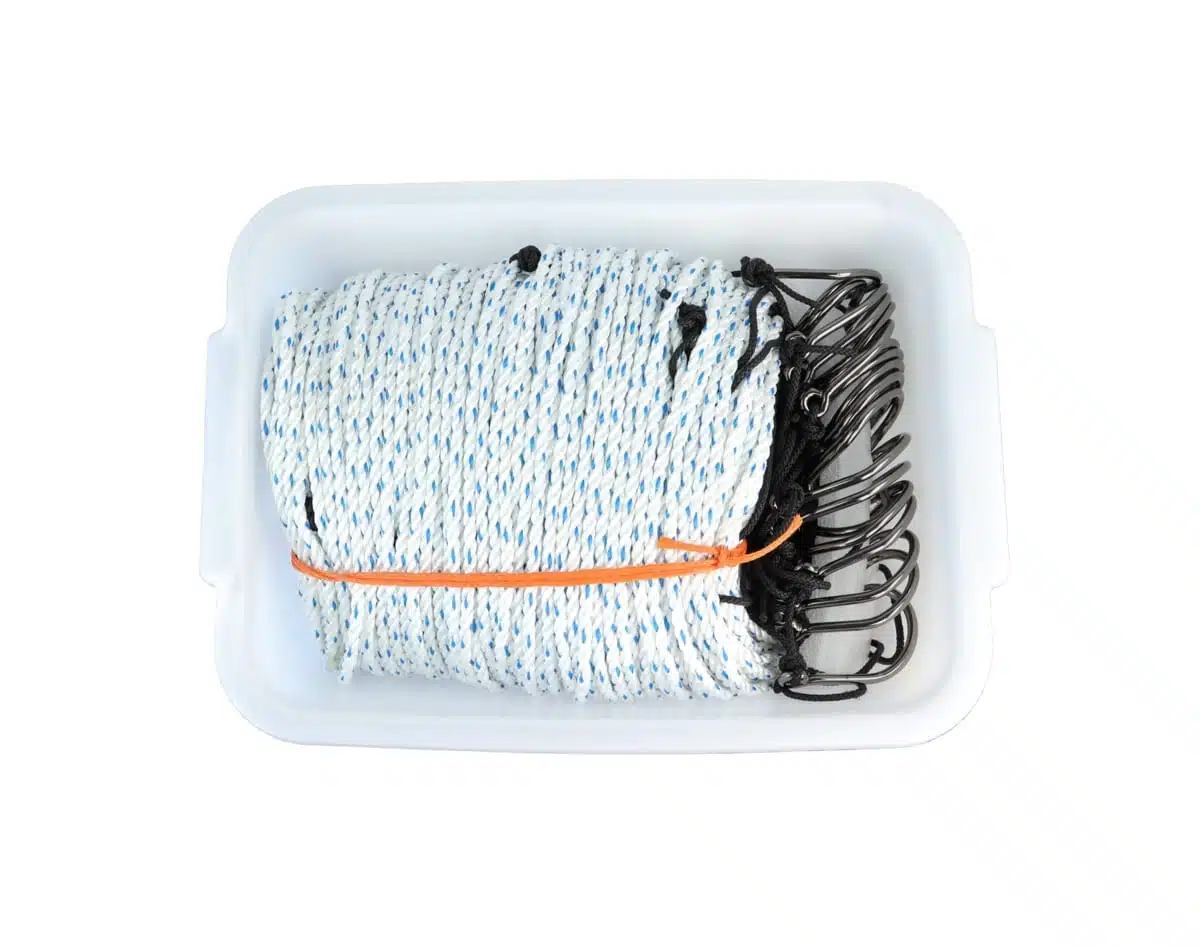 CAL Kveiteline – 180m (kveitvad) kommer i praktisk oppbevaringsboks med 180m 5,0mm synketau, 20 stk Mustad / Catch sirkelkrok #16/0. Montert med 9 meter mellom krokene og 1,2 meter fortommer i 3,0mm sort flettet polyester. Fortom er knyttet direkte på krok og hovedline.