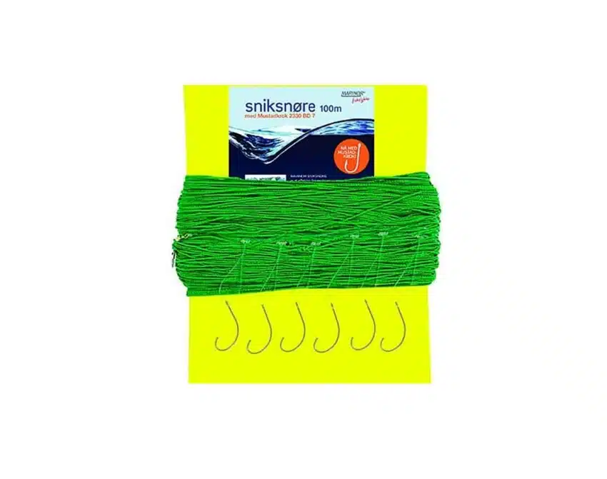 Marinor Sniksnøre – 100m er effektivt på alle dyp, lettvint å håndtere og fisker godt. Du henger på et lodd ca. 1kg, agner med makrell, sild eller reke (Bruk gjerne sei hvis du jakter steinbit), slipper krokene til bunns, og så er det bare å vente. Enten du har deg en fisketur, drar teinene eller venter natten over, så er det like spennende å se hva som biter på.