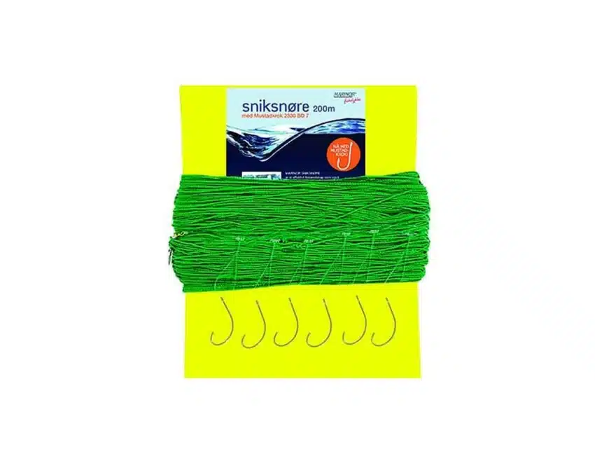 Lagerføres i 100m og 200m snøre med 6 rustfrie Mustad kroker i str. 4/0.