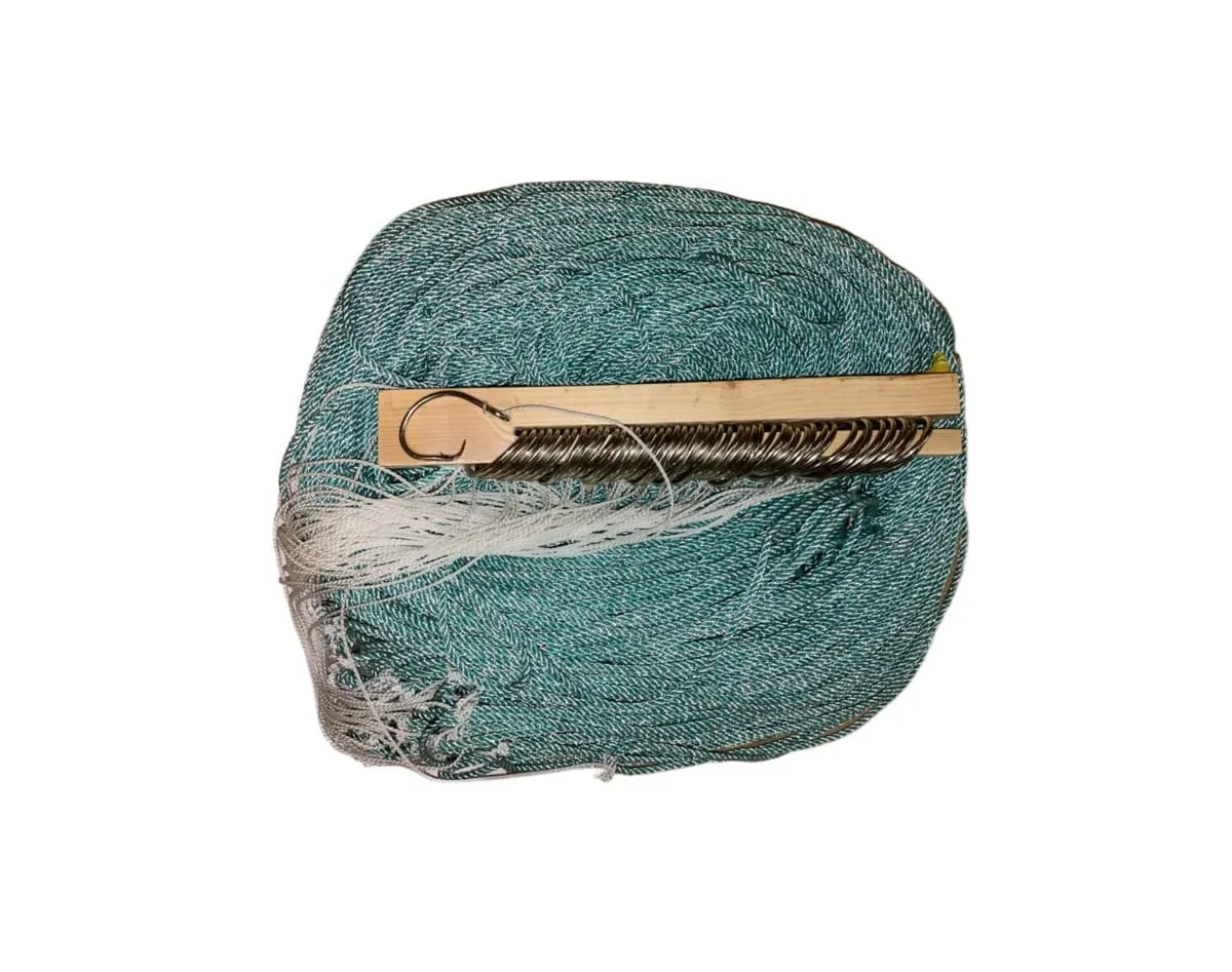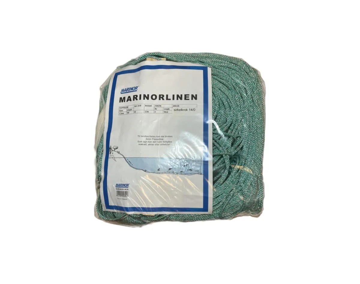 Marinorlinen – 50 sirkelkrok (bakkeline) er norskprodusert og kommer med 180m 3,5mm flipperline, 50 stk Mustad / Catch sirkelkrok #14/0. Montert med 3,5 meter mellom krokene og 50 cm forsyn no. 6 – knyttet direkte på krok og hovedline.