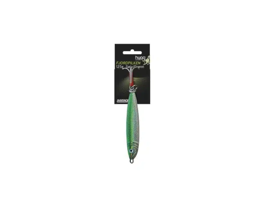 Fjordpilken Hugg Sølv/Grønn – 125g er en sildeformet pilk som grunnet sin fasong går kjapt ned og muligheten for at pilken henger seg opp reduseres. Skjellmønster, sølv med grønn rygg og rød attraktor-slange på dregg. En meget bra sluk til fiske etter lyr, sei og torsk.