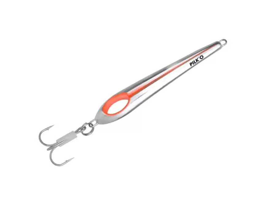 Pilk’O UV Orange Flash – 400g er en svært innovativ pilk med 15-graders krumning og UV-øyehull. Øyet og siden av Pilk’O er belagt med UV-farge, noe som skaper et tydelig visuelt mål under vann. Den 15-graders krumningen gir pilken en variert oscillerende bevegelse som frister selv de mest forsiktige fiskene til å bite.