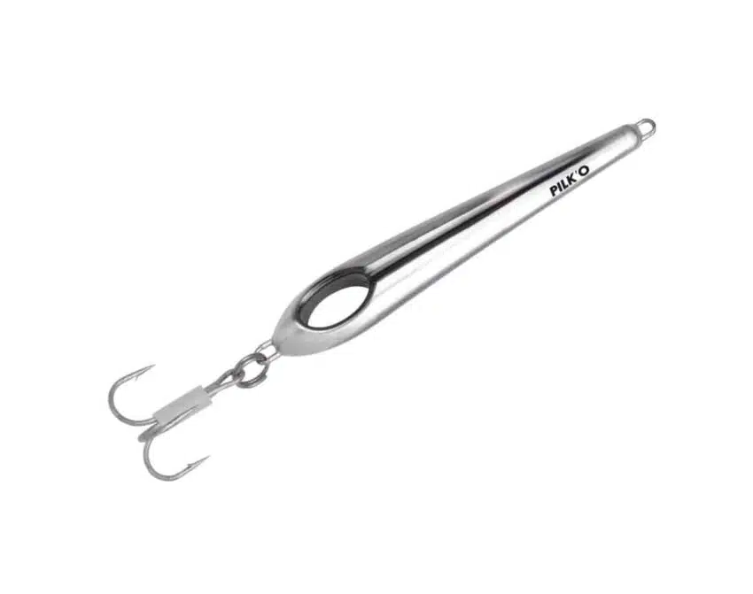 Pilk’O UV Pollack – 300g er en svært innovativ pilk med 15-graders krumning og UV-øyehull. Øyet og siden av Pilk’O er belagt med UV-farge, noe som skaper et tydelig visuelt mål under vann. Den 15-graders krumningen gir pilken en variert oscillerende bevegelse som frister selv de mest forsiktige fiskene til å bite.