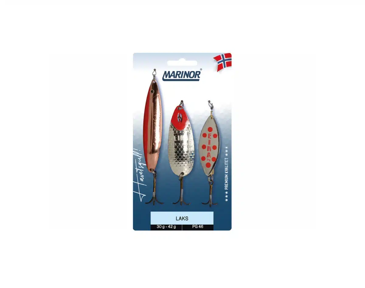 Marinor Laksesluker – 3pk er satt sammen av Marinor bestselgere og fortjener en plass i enhver laksefiskers slukskrin. Settet kommer med den populære Einasluken (30g), Eina laksespinner (31g) og Sognesilda (26g).