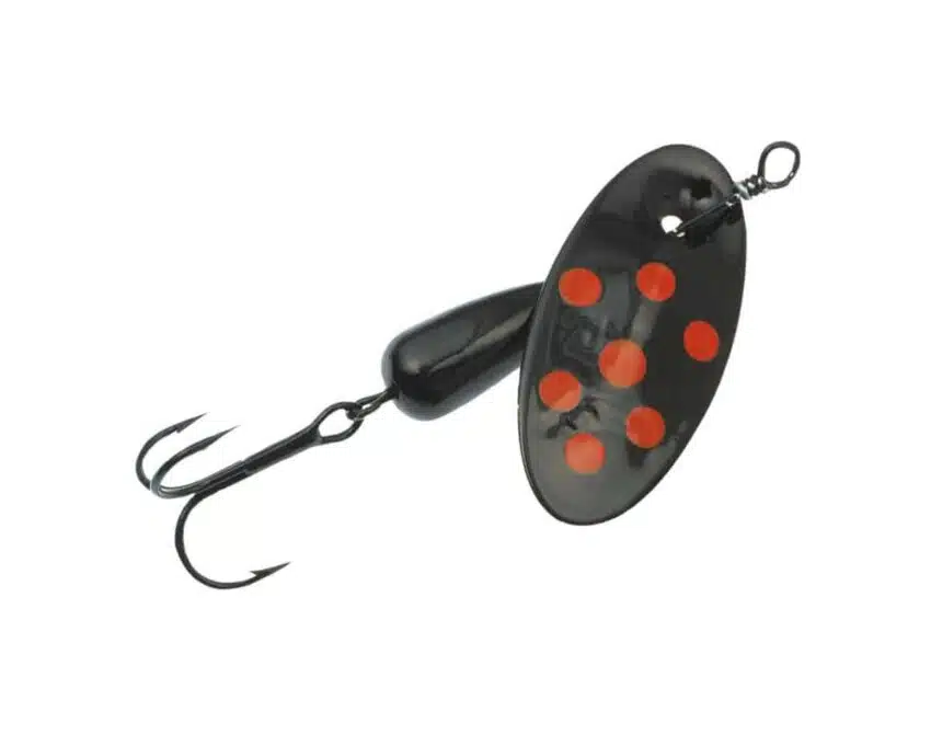 Panther Martin Spotted Black with Fluorescent er en spinner med sterke og dramatiske farger, noe som har gjort den til en favoritt blant fiskere. En meget populær spinner som er effektiv på mange fiskearter, blant annet ørret, abbor, walleye og gjedde, i større størrelser er den også effektiv på muskellunge (muskie).