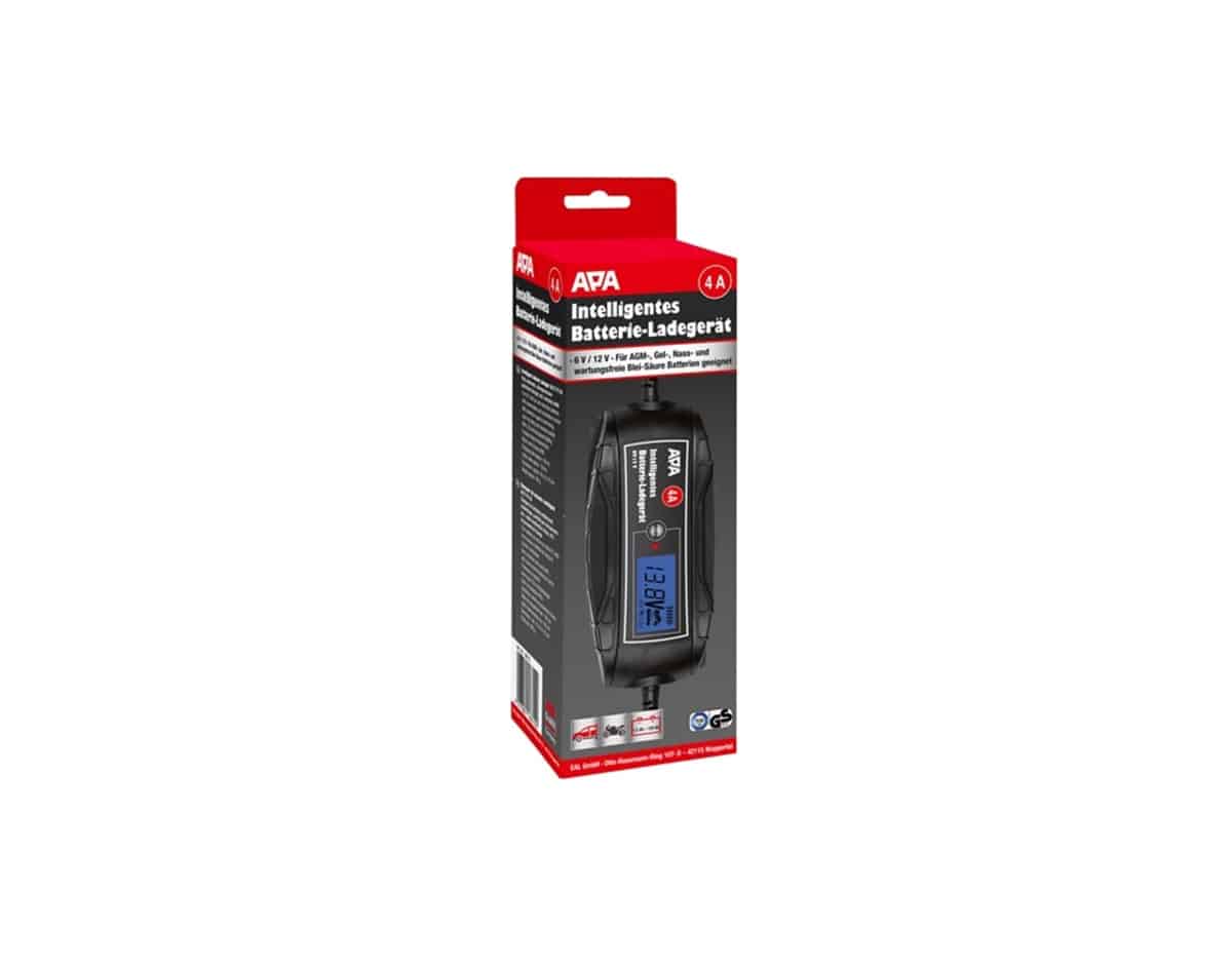 Batterilader helautomatisk – 6/12V fra tyske APA er en avansert lader med mikroprossesorstyring, 9-stegs ladeautomatikk, og LCD skjerm med bakgrunnsbelysning, som viser ladestatus m.m. I tillegg til oppladning og vanlig vedlikeholdsladning har laderen et gjenopprettingsmodus, som muliggjør oppladning av helt tomme batterier.