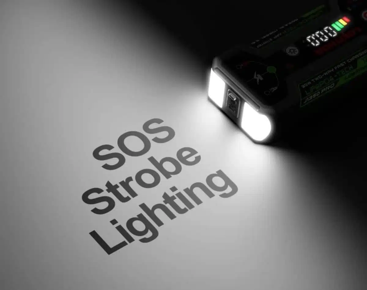 Starthjelpen er utstyrt med 200 lumen LED-arbeids- og nødlys, samt innebygd beskyttelse mot kortslutning og feil polaritet. Det digitale displayet viser batterispenning og gjenværende kapasitet, mens LED-indikatorer lyser grønt når batteriet er korrekt tilkoblet.