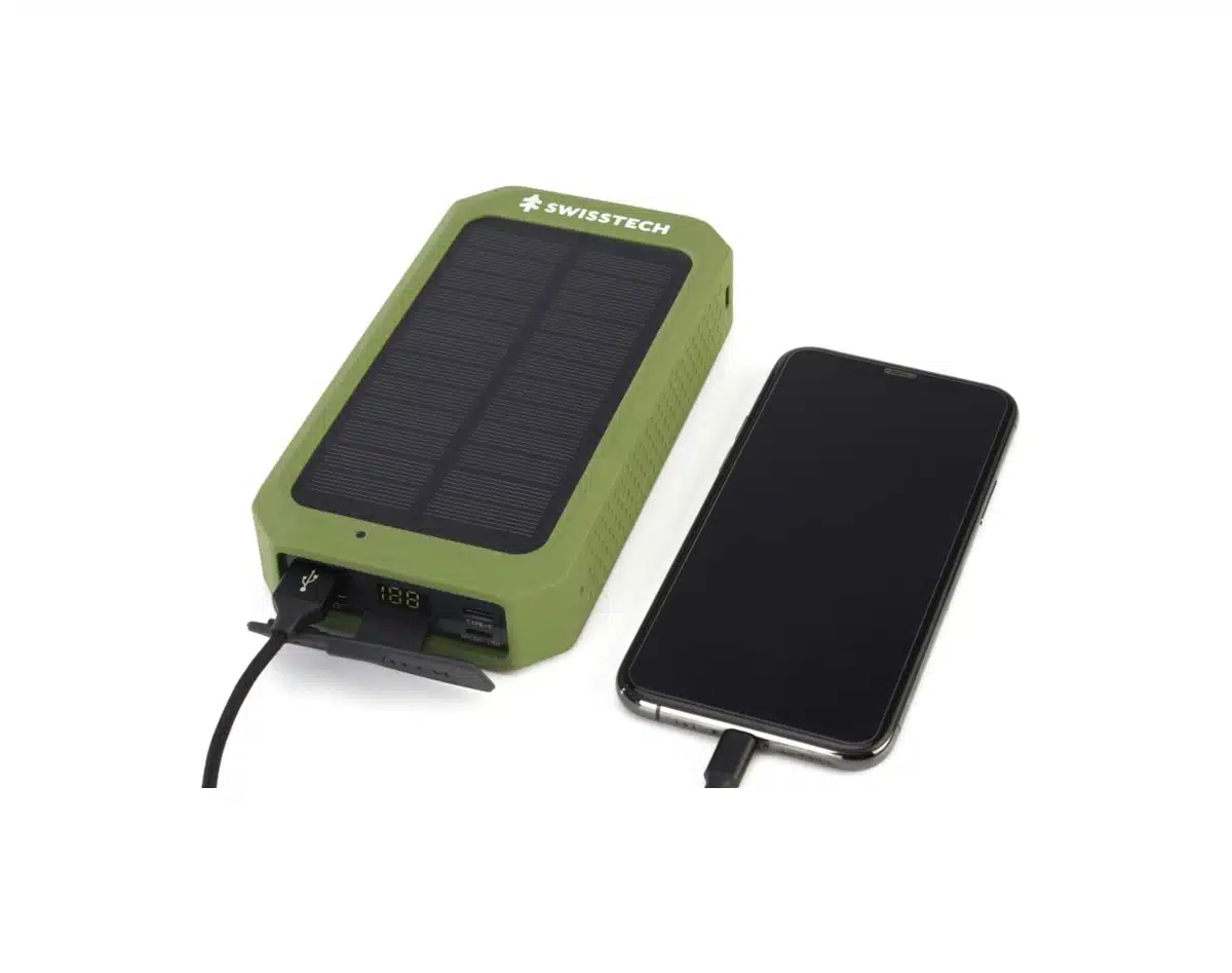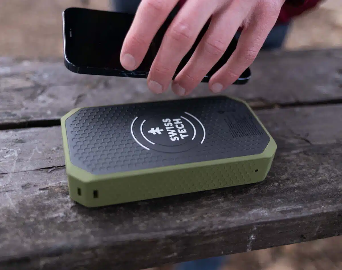 SwissTech 20000mAh trådløs powerbank er selvsagt sprutsikker (IP54), slik at den fungerer optimalt under alle forhold, også i snø, sludd og lett regnvær, noe som gjør den til den perfekte følgesvennen for utendørseventyr.