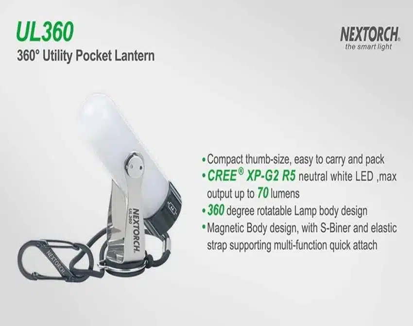 Nextorch UL360 Multilykt er en multifunksjonell lommelykt / lommelanterne, kompakt i størrelse og lett å bringe med seg. UL360 fungerer via en nøytral hvit CREE® LED, mer skånsom og uten å skade øynene under lang tids bruk.