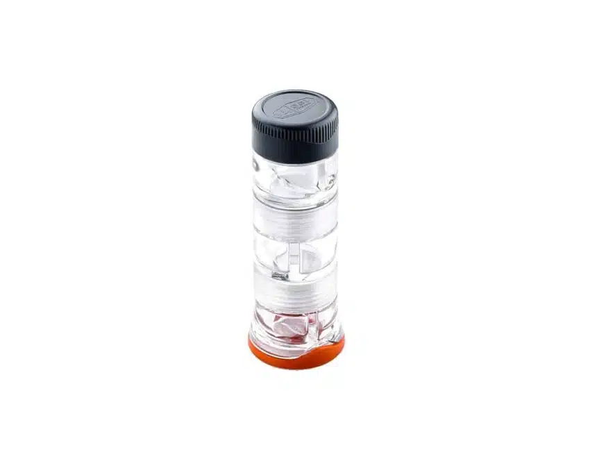 Krydderbøsse Spice Missile har salt- og pepperbøsse, samt to glass med totalt fire rom til å fylle på andre krydder. Plass til 3 ml i hvert «rom». Vanntette lokk, og et stort lokk (i bunnen) som gjør det enkelt å fylle på mer. Enkelt å bytte rekkefølge på krydderglassene (skrus på hverandre). Alle deler kan tas fra hverandre for rengjøring. Krydderbøssen er lett, kompakt og perfekt til bruk når fisken skal tilberedes ute i det fri.