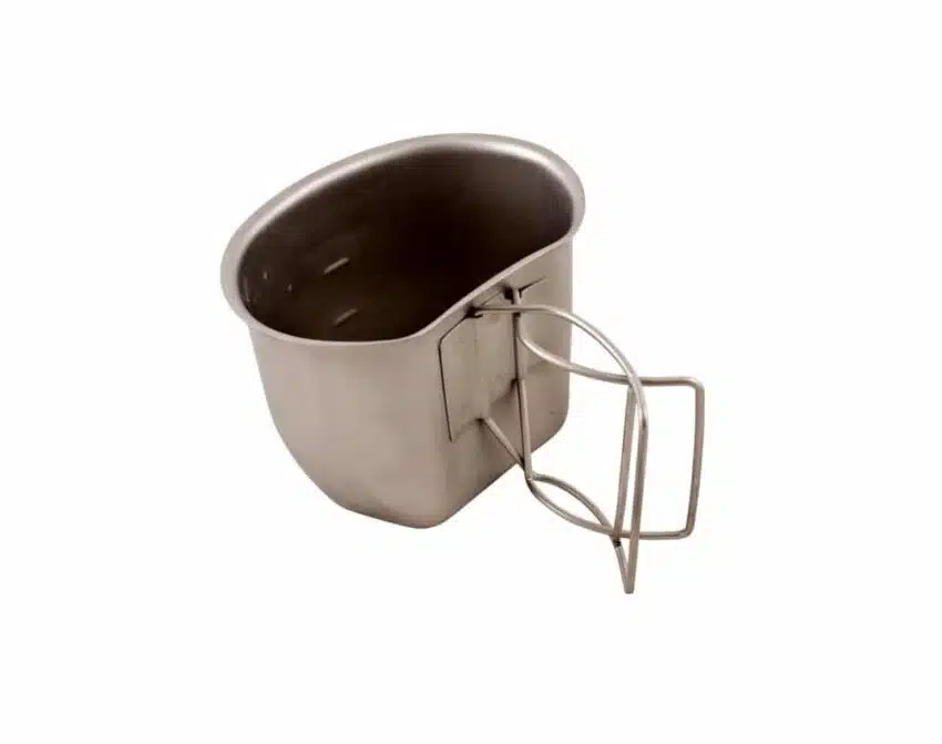 Metallhåndtaket på baksiden av koppen er hengslet slik at det kan brettes rundt selve koppen, noe som bidrar til å redusere pakkestørrelsen.