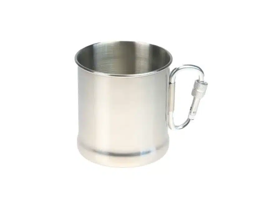 CAL Drikkekopp m/karabiner rommer 300ml drikke og er laget i stål, med karabinkrok for feste til belte eller ryggsekk. En solid kopp, lett i vekt og god å drikke av.