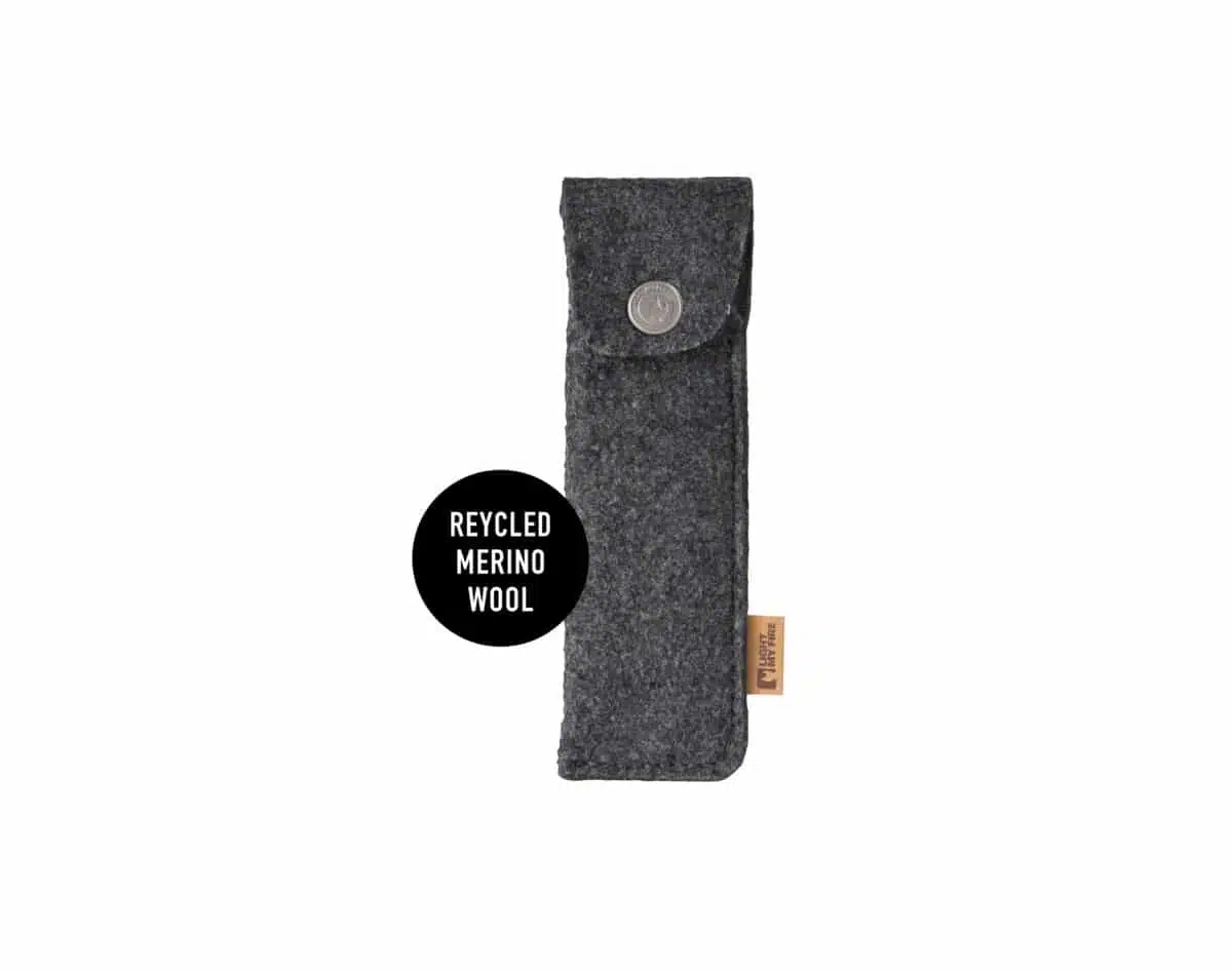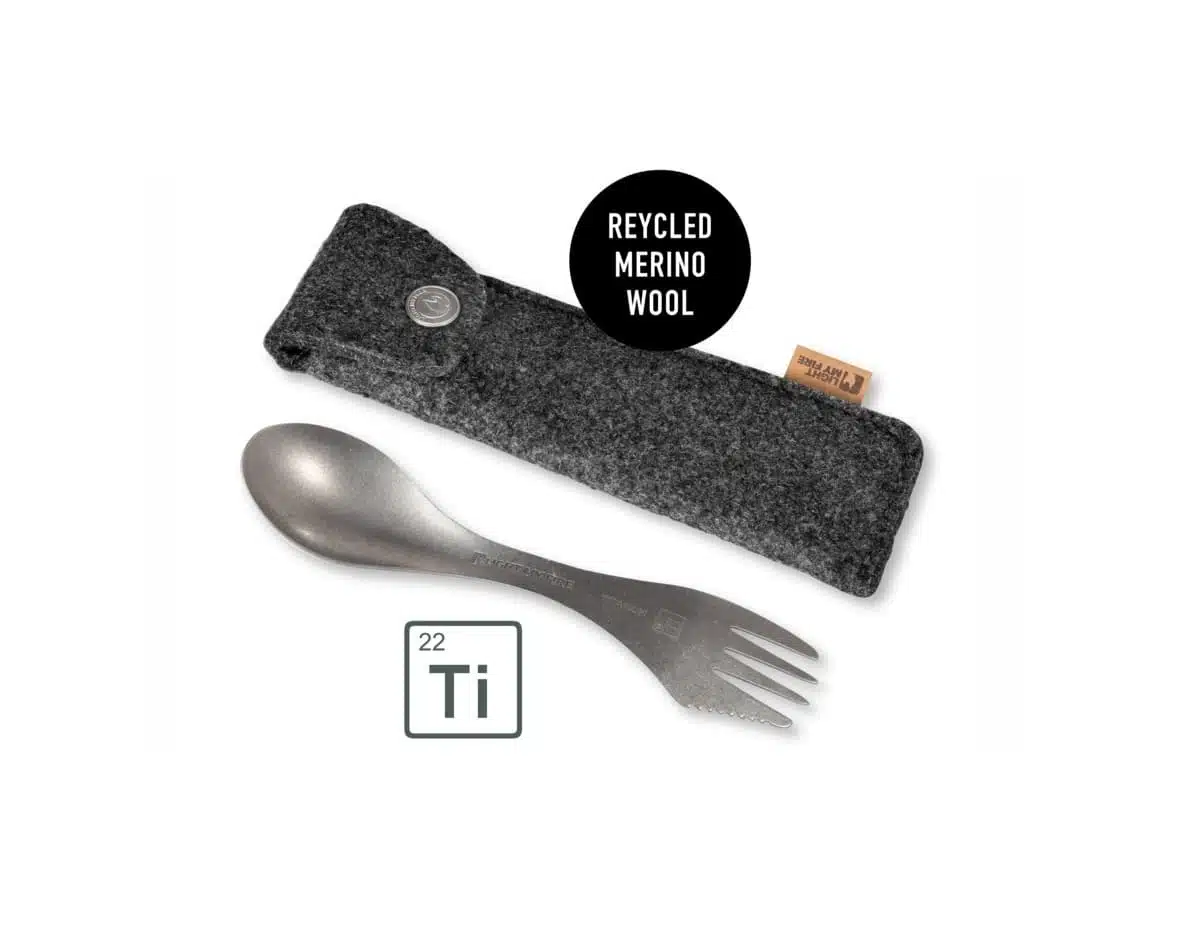 Light My Fire Spork Kit Titanium er den ikoniske kniv-skje-gaffel kombinasjonen laget i et lett materiale, som varer evig – med et flott oppbevaringsetui som er laget i resirkulert merinoull er dette det perfekte bestikk til backpacking og reise, såvel som til hverdagsbruk.