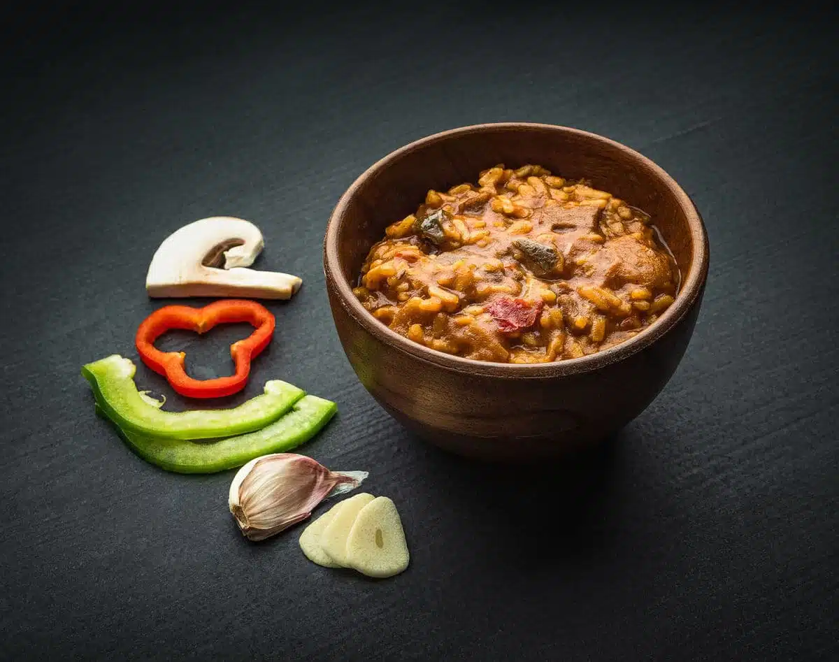 - 35% ris, 16% kjøttprodukt av storfekjøtt (84% storfekjøtt, salt, vegetabilsk fiber (potet, gulrot, bambus), stabilisator (E450), antioksidant (rosmarinekstrakt)), 10% paprika, løk, tomat, 5,7% sjampinjong, rapsolje, hvetemel, sellerirot, maisstivelse, kjøttbuljong (gjærekstrakt, maltodekstrin, salt, rapsolje, kjøttekstrakt, karamellisert sukker, løk), tomatpuré, soyasaus (soya, salt, eddik), aroma, 0,5% hvitløk, krydder, ingefær, sukkerkulør (karamell, maltodekstrin), salt, antioksidant (rosmarinekstrakt, askorbinsyre).