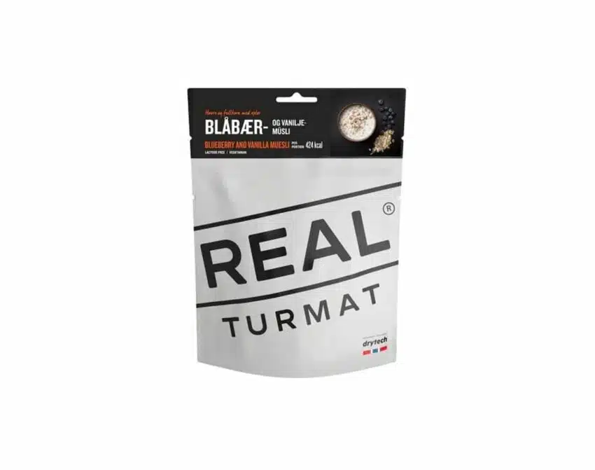 REAL Turmat Blåbær og vaniljemüsli er en søt, laktosefri müsli blanding med blåbær og vanilje. Gir deg pangstart på morgenen og god metthetsfølelse. Kan tilberedes med kaldt eller varmt vann.