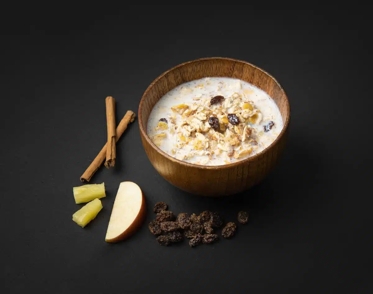 - 62% Müsli (havregryn, helkorn hvete, 15% rosiner, 10% ananasbiter (sukker, ananas), maismel, havremel, sukker, salt, byggmalt), 31% tørrmelk (skummet tørrmelk, sukker, 1,8% kanel), 7% eplebiter.