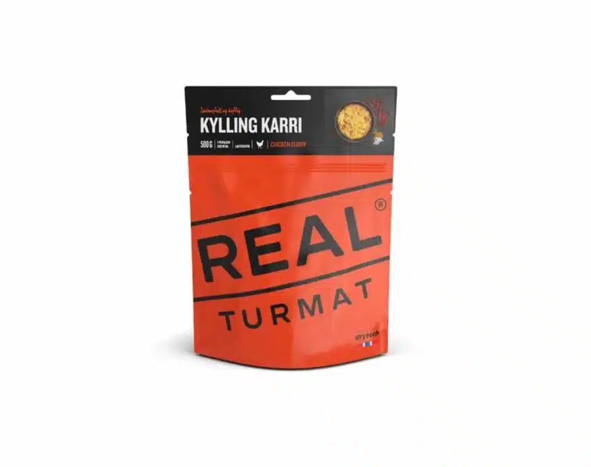 REAL Turmat Kylling karri, klassisk gryte med ris i smakfull karrisaus i porsjonspakker, spesielt utviklet for deg som er glad i naturen og som har behov for et varmt, næringsrikt og fullverdig måltid.