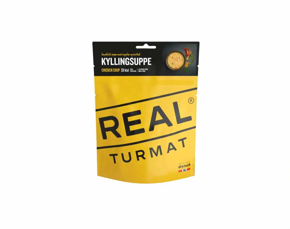 REAL Turmat Kyllingsuppe er en smakfull suppe med ingefær, hvitløk og store biter kyllingkjøtt. Spesielt utviklet for deg som er glad i naturen og som har behov for et varmt, næringsrikt og fullverdig måltid.