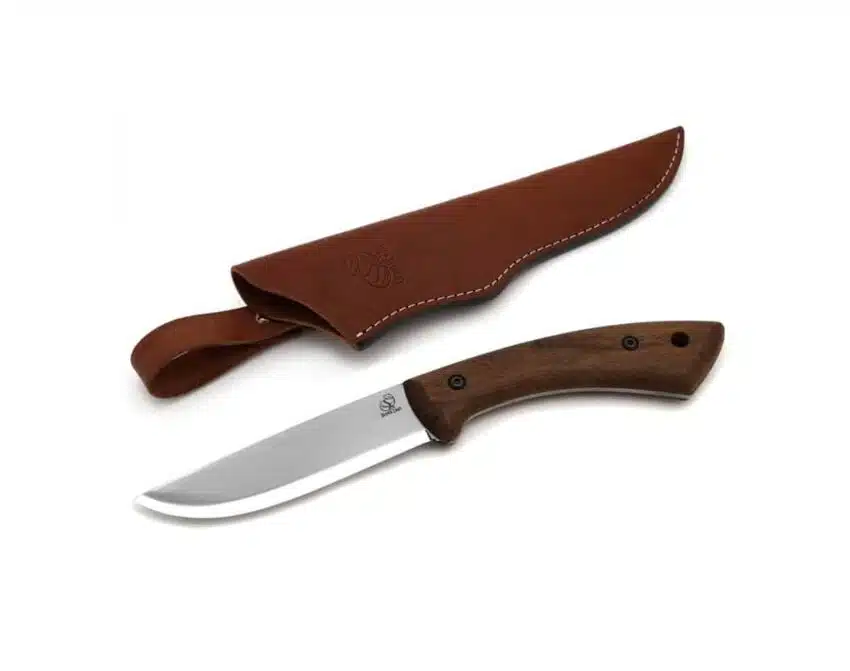 Knivbladet er laget av av toppkvalitets spesialherdet karbonstål med en hardhet på 57-59 HRC, og knivskaftet er laget av valnøtt, impregnert med linolje og voks. Det er slående at skaftet er relativt tykt, noe som gjør det perfekt også for personer med store hender.