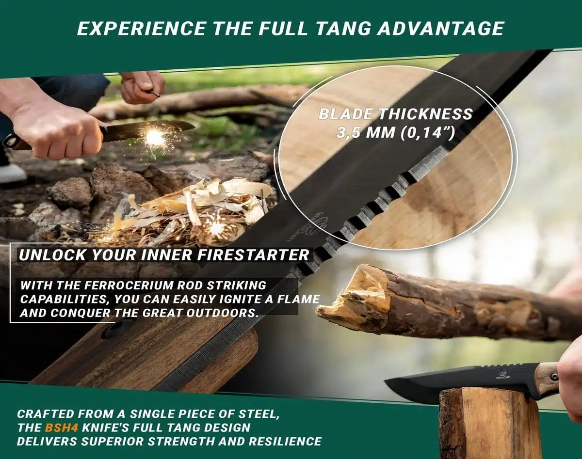 BeaverCraft Bushcraft Kniv – BSH4 er den ultimate bushcraft kniven, håndsmidd av BeaverCraft i Ukraina. Kniven har et solid, ultraskarpt blad, perfekt for å lage mat, hugge ved, åpne hermetikkbokser og som striker til tennstålet.