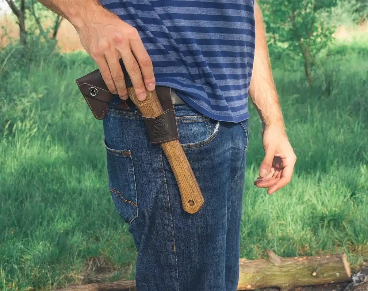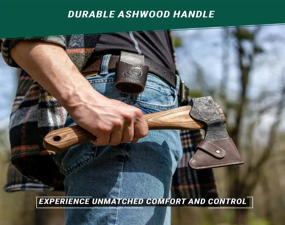 BeaverCraft Bushcraft Øks – AX1 har en perfekt balanse mellom skaft og blad for komfortabelt, effektivt og sikkert arbeid. Øksen kommer med eggbeskytter og beltefeste i ekte lær, for å beskytte bladet under lagring og bæring.