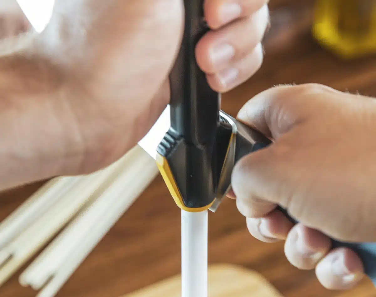 Den fine keramiske silpeoverflaten fjerner lite materiale for å tilbakeføre knivseggen til den skarpe kniven du trenger for å komme videre i arbeidet. Plasser den keramiske stangens gummitupp på arbeidsbenken for sikker og stabil honing.