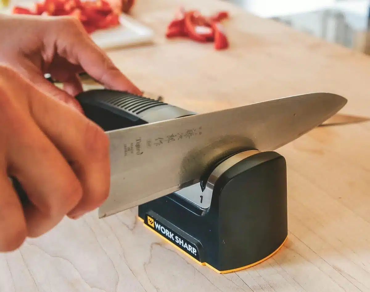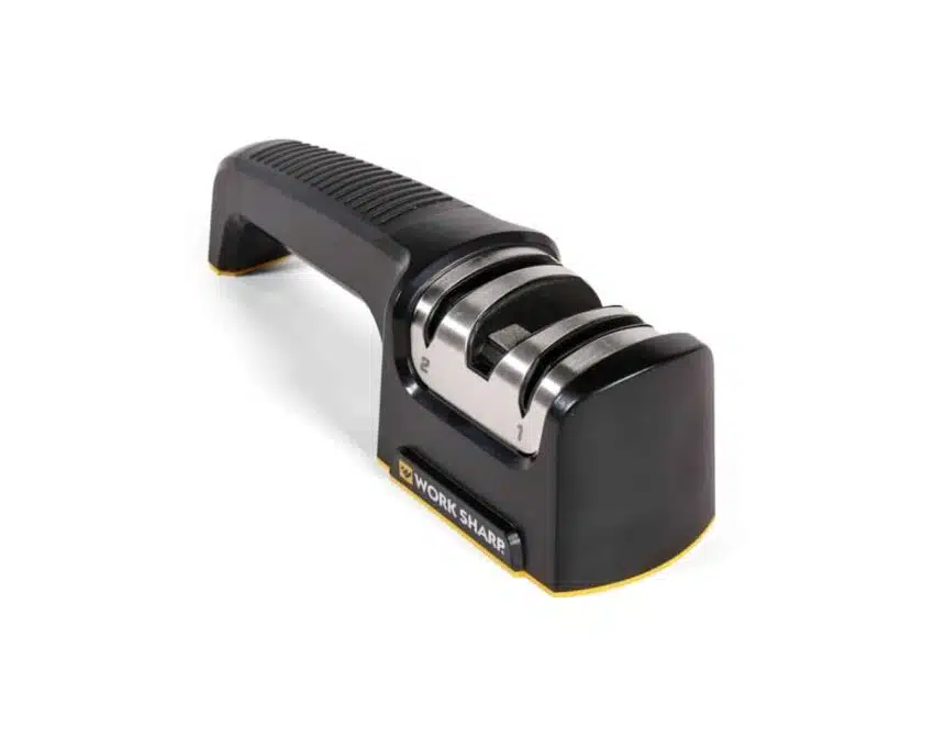 Work Sharp PTS Manuell knivsliper er en rask, enkel og effektiv måte å slipe kjøkkenknivene på. Diamantslipehjul og keramiske honinghjul er forhåndsinnstilt i optimal vinkel for raskt og konsekvent å gjenopprette en skarp egg og finpusse eggen tilbake til optimal skarphet. Bruk keramikkhjulene daglig for å opprettholde den skarpe eggen.