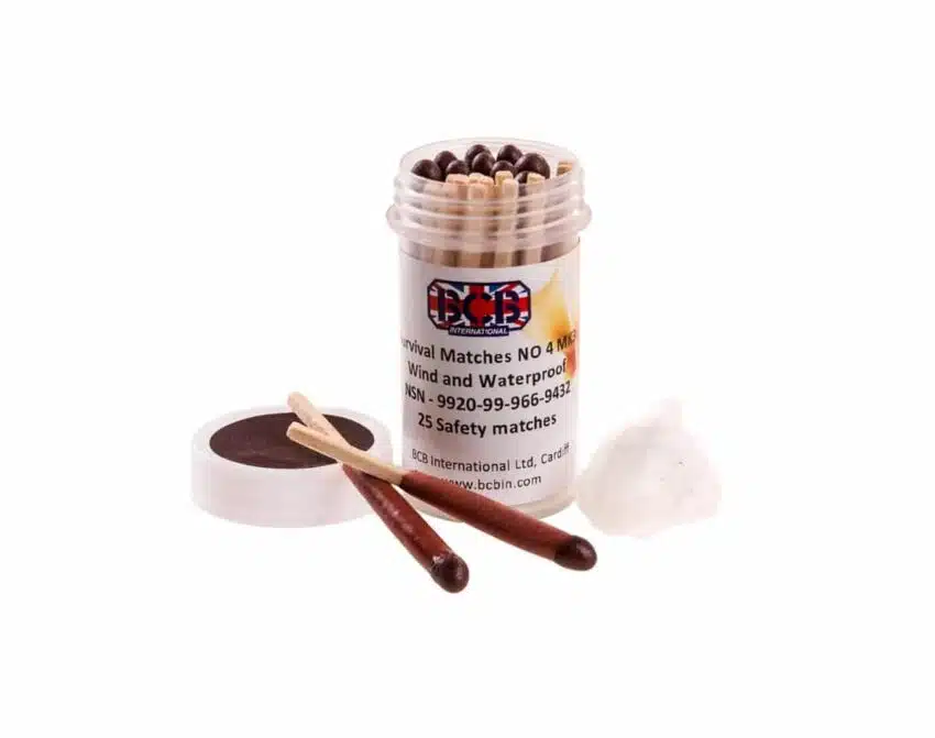 BCB Survival Matches er godkjent av NATO og leveres komplett i en vanntett beholder som inneholder 25 fyrstikker og 2 rispeflater.