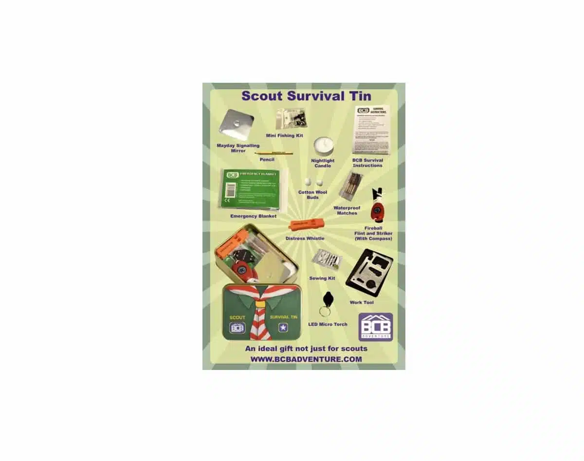 BCB Speiderens Survival Tin passer perfekt i bukselommen og inneholder massevis av nyttige “speider gadgets” som kan hjelpe deg dersom det oppstår mindre og uventede problemer under speider-turen.