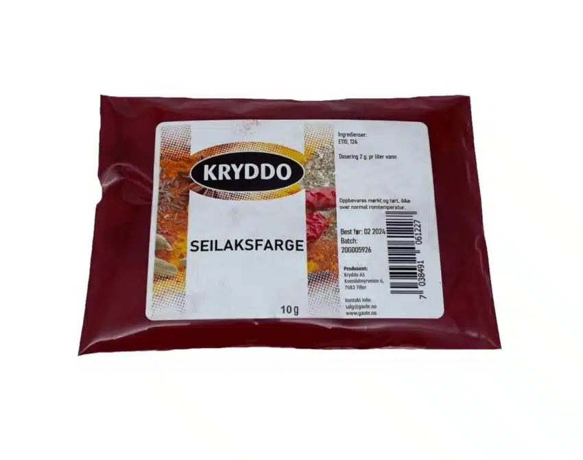 Seilaksfarge (hummerfarge *) er et fargestoff for farging av fisk. 2g seilaksfarge til 1 liter vann gir passende mengde fargebad for 1-3 kg seifilet. Se også vårt pakketilbud på røyksyre og seilaksfarge, samt vårt røyksalt som passer godt til det meste av varmretter, men brukes særlig til å gi en lettrøkt smak på kokt eller stekt fisk.