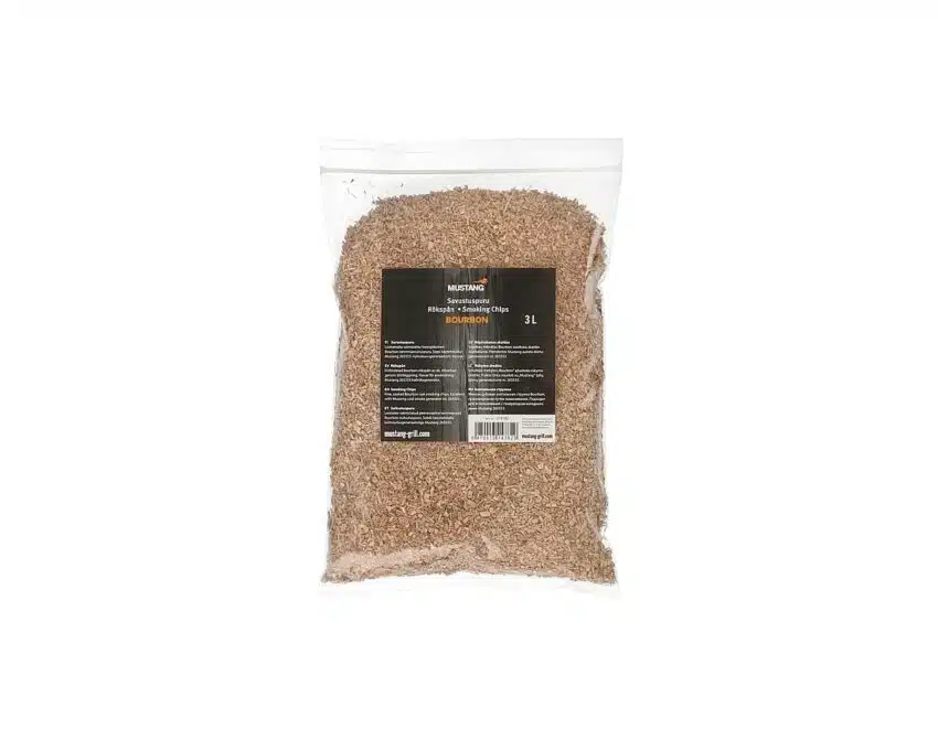 Mustang Røykespon Bourbon er et finkornet røykespon av EIK og kommer i pose à ca. 3 liter (640g). Sponen av eik er dyppet i bourbon whisky og brukes primært til kaldrøyking i en ordinær røykutvikler eller spiral, men er også godt egnet til varmrøyking.