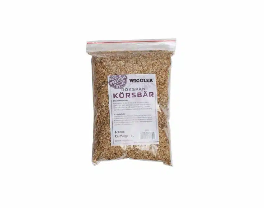 Wiggler Røykespon KIRSEBÆR er en premium kvalitet røykespon av kirsebærtre. Inneholder ca. 250 gram og er bra til fjørfe, svinekjøtt og oksekjøtt. Noen sier at kirsebærtre er den beste tresorten til røyking av mat, og da spesielt bacon.